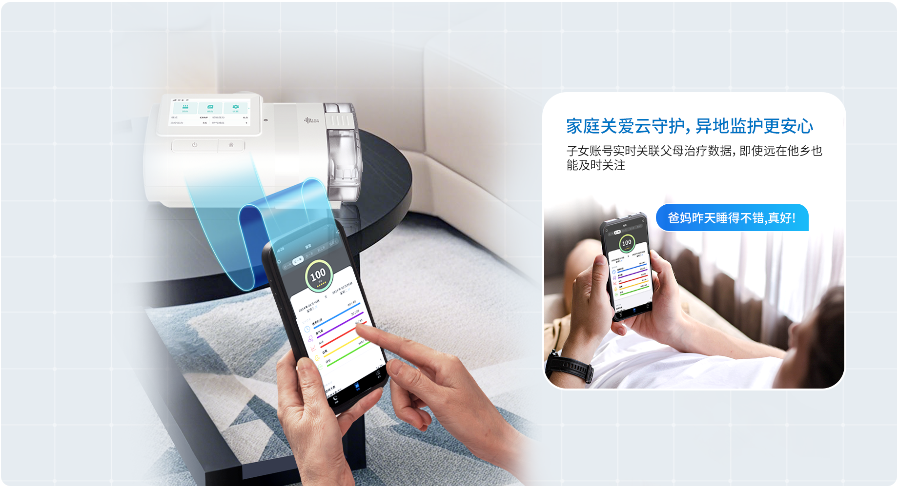 当前设置和使用情况自动生成报告,一键分享至呼吸治疗师提供专业解读,让疗效进展看得见摸得着