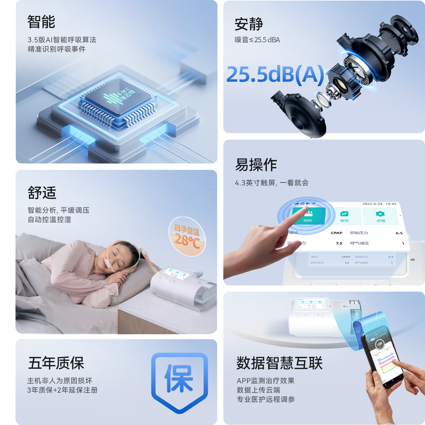 多重升级,优化呼吸机的动态噪音真正做到从吸气到呼气都静谧自然